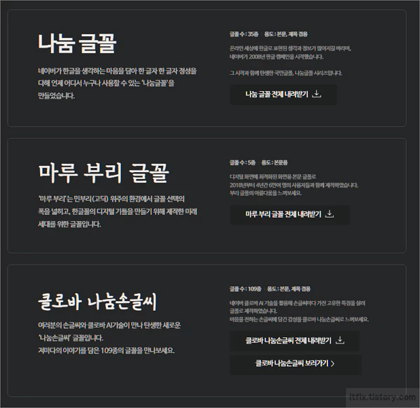 네이버에서 개방한 자체 제작 무료 폰트로 위의 페이지에서 스크롤을 아래쪽으로 내리면 대표적이 3개의 카테고리인 나눔 글꼴(35종), 마루 부리 글꼴(5종), 클로바 나눔 손글씨(109종)이 보입니다. 각 카테고리를 클릭해 들어간 다음 세부 폰트의 모양들을 웹에서 직접 확인한 다음 다운로드할 수 있습니다.