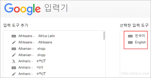 2. 구글 입력기 옵션에서 한국어와 영어를 추가합니다.