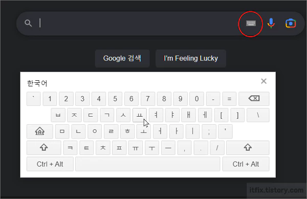 아마 많은 시스템에서 구글 브라우저를 열고 키보드 아이콘을 클릭해 마우스로 한글을 입력하고자 할 경우 아무런 작동을 하지 않는 경우가 많을 것으로 보입니다.