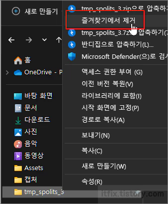 즐겨찾기 항목에 폴더들이 너무 많아 산만하다면 마우스 우클릭 후 즐겨찾기에서 제거를 통해 깔끔하게 정리할 수 있습니다.