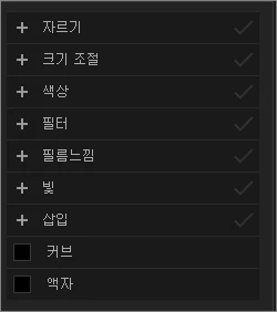 우측의 메뉴에는 일괄 편집시에 할 수 있는 작업들의 목록이 있는 데, 상당히 많은 작업을 진행할 수 있다는 것을 알 수 있습니다. 메뉴에서 보다시피 자르기, 크기 조절, 색상, 필터, 필름느낌, 빛, 삽입, 커브, 액자 등 많은 일괄 편집 작업을 한 번에 진행할 수 있습니다.