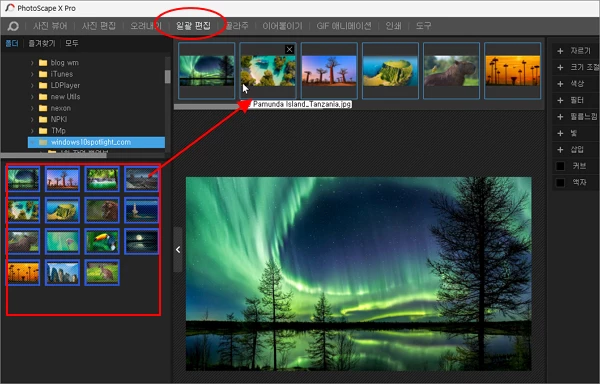 먼저 상단 메뉴에서 일괄 편집을 선택한 다음 왼쪽 창에서 일괄 편집을 진행할 폴더를 선택해 줍니다. 그다음으로 일괄 편집할 이미지 파일 모두를 드래그하여 선택한 다음 우측 상단의 가로 막대 모양의 창으로 끌어다 놓습니다.