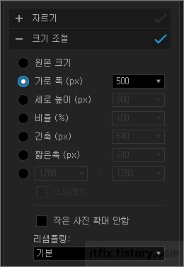 먼저 가로 픽셀 크기를 500으로 조정해 줍니다. 아래쪽의 작은 사진 확대 안함에 체크하지 않으면 가로 크기가 500보다 작은 이미지들은 자동으로 500으로 확대됩니다.