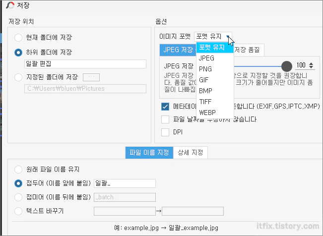 이제 일괄 편집의 마지막 단계로 일괄 편집된 이미지들을 저장할 폴더를 지정해 주고 그 폴더와 파일의 이름, 포맷 등을 지정해 주는 최종 단계의 작업을 수행하면 됩니다.
