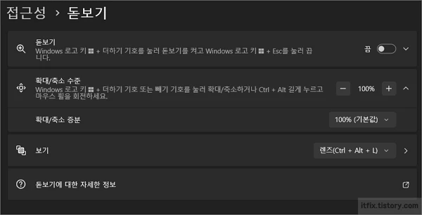 관련 설정은 윈도우 설정 > 접근성 > 돋보기에서 할 수 있습니다.