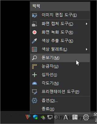 기타 내용으로 캡처 프로그램으로 주로 쓰이는 픽픽에서도 돋보기 기원을 부가 기능으로 지원하고 있는 데, 픽픽에서 확대 창이 사각형 형태로 화면 왼쪽 상단에 고정되며 그곳에 마우스 커서가 위치한 곳의 확대 또는 축소 이미지를 보여주게 됩니다.