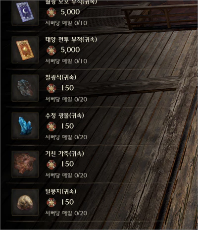 아래의 이미지에서 보다시피 철광석, 수정 광물, 거친 가죽, 털뭉치 등을 매일매일 20개까지 포인트 구매가 가능합니다. 구지 현질하지 않아도 이 부분도 느리긴 하지만 따라갈 수 있도록 만들어 둔 배려가 보입니다.