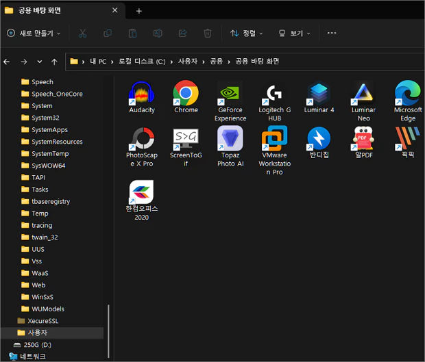 제 폴더에서 보면 기본 바탕 화면 경로에서 보이지 않았던 모든 아이콘들이 이곳에 있는 것을 확인할 수 있습니다.