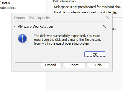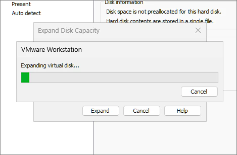 우측의 Expand disk capacity 부분의 Expand 버튼을 누르면 가상 머신의 사용 공간 확장 작업을 시작하게 됩니다.