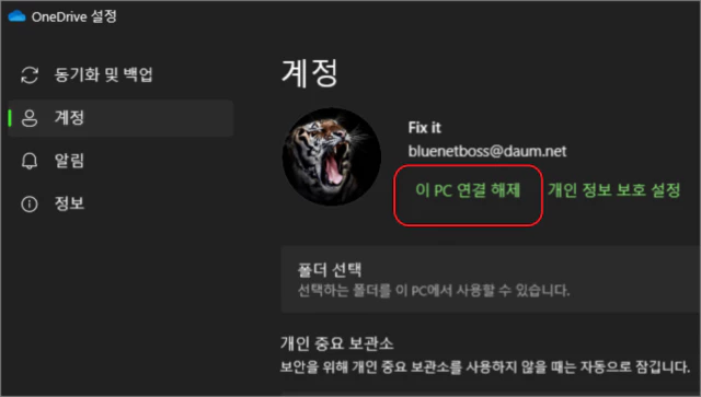 윈도우 설정의 원드라이브 설정 창이 열리면 이 PC 연결 해제를 클릭해 줍니다.