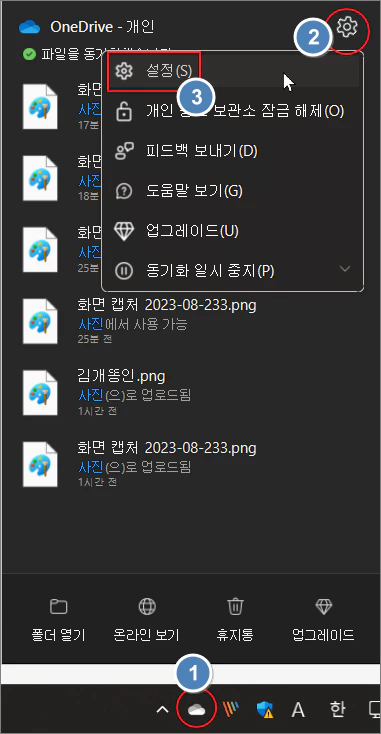원드라이브 연동을 해제하는 방법은 작업 표시줄 우측의 원드라이브 아이콘을 클릭한 다음 설정을 누릅니다.