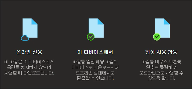 파란색 구름 모양의 표시가 붙어 있는 경우는 온라인 전용 파일을 의미하며 로컬 PC에는 존재하지 않고 원드라이브에만 존재하는 경우가 연동되어 있다는 표시입니다. 로컬 PC의 드라이브 저장소 공간을 절약하는 장점이 있지만 인터넷 연결이 끊어진 경우나 원드라이브 연결이 해제된 상태에서는 사용할 수 없다는 단점이 있습니다.