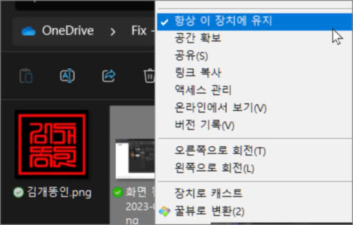위의 일반적인 공유 상태의 파일이나 폴더를 마우스 우클릭한 다음 항상 이 장치에 유지를 선택하면 이러한 상태로 변경할 수 있습니다. 좀 더 강력한 보안 형태로 저장소 센스의 공간 관리 활동에 의해 삭제되지 않습니다.