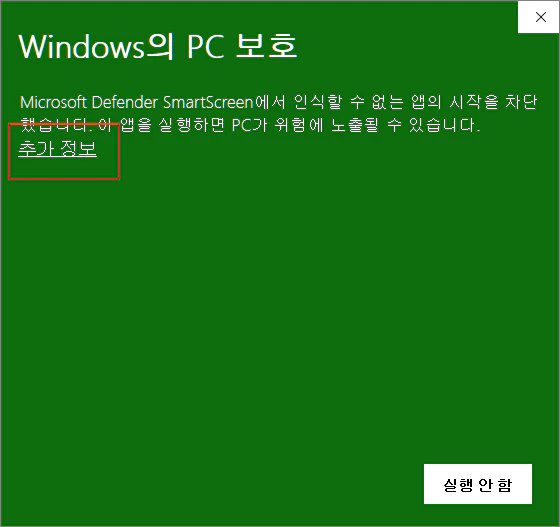 설치를 누르게 되면 윈도우 보안 경고 창이 나타나게 되는 데, 추가 정보 텍스트를 클릭한 다음 설치를 계속 진행합니다.