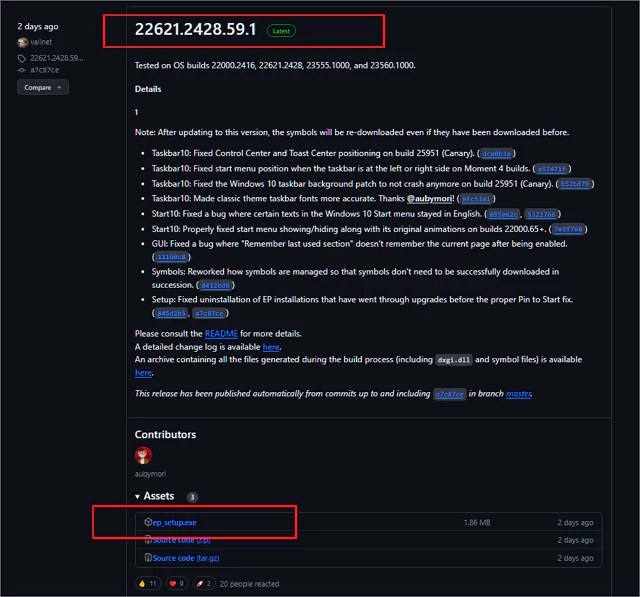 각 포스팅은 버전 넘버를 표시하고 있으며 우측으로 Pre-release 또는 Latest 표기가 있는 데, 보통은 Latest 표시가 붙은 제목을 클릭하면 아래쪽으로 다운로드할 수 있는 설치 파일이 나타나게 됩니다. 설치 파일인 ep_setup.exe 파일을 다운로드하여 설치하면 됩니다.