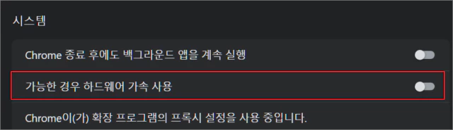 다음으로 크롬 설정에서 시스템 항목에 있는 가능한 경우 하드웨어 가속 사용 항목의 스위치를 꺼둡니다.