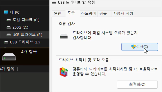 그 다음으로 USB 속성 창에서 도구 탭을 선택한 다음 오류 검사 항목의 검사 버튼을 눌러 USB 드라이브의 오류를 검사하고 복구를 시도합니다.