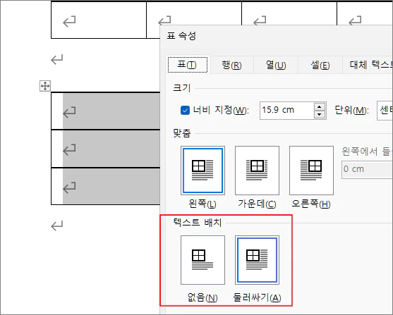이러한 공간이 생기는 이유는 표속성에서 텍스트 배치가 둘러싸기로 기본값 설정되어 있기 때문입니다.