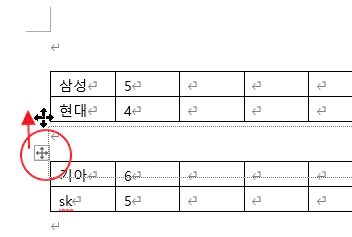 기타, 또 다른 표의 병합 방법으로 커서가 위치한 표의 왼쪽 상단 모서리에 생긴 작은 사각형을 드래그하여 병합하려는 표 쪽으로 이동시켜도 두 개의 표가 병합됩니다.