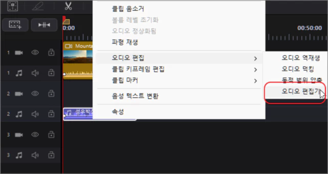 다음으로 음성 영역을 마우스 우클릭후 오디오 편집기를 클릭합니다.