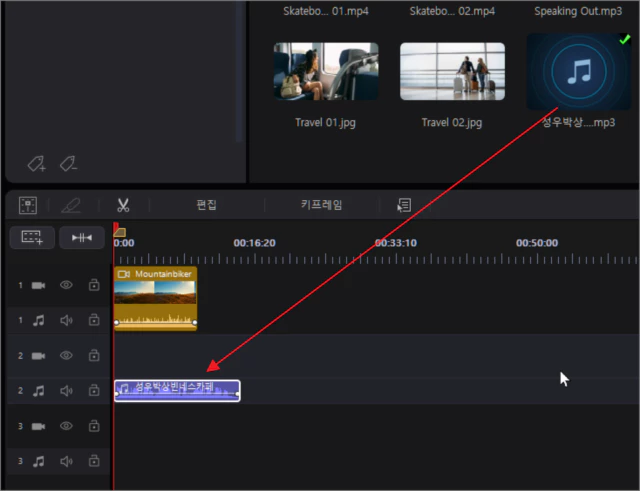 파워디렉터 상단 메뉴의 파일 > 가져오기 > 미디어파일을 클릭해 음성 파일을 불러온 다음 아래로 드래그하여 편집 중인 동영상의 영역에 가져다 놓습니다.