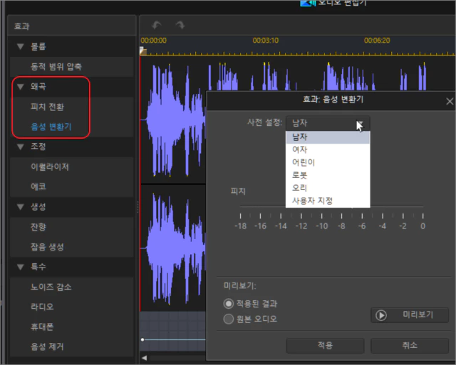 오디오 편집기가 열리면 왜곡 > 음성 변환기를 클릭하여 원하는 변환 결과 목표물을 설정해 준 다음 미리 보기를 통해 피치를 조정해 주면서 가장 원하는 근사치값을 얻어 내면 됩니다.