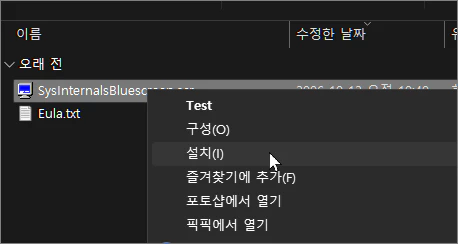 다운로드한 파일의 압축을 해제하면 SysInternalsBluescreen.scr이라는 파일이 보입니다. 해당 파일을 마우스 우클릭한 다음 설치를 클릭하면 화면 보호기의 설치가 완료됩니다. 만일 오래된 운영체제이어서 설치 메뉴가 없다면 해당 파일을 윈도우 폴더 아래의 시스템 32 폴더 속에 복사해 넣습니다.