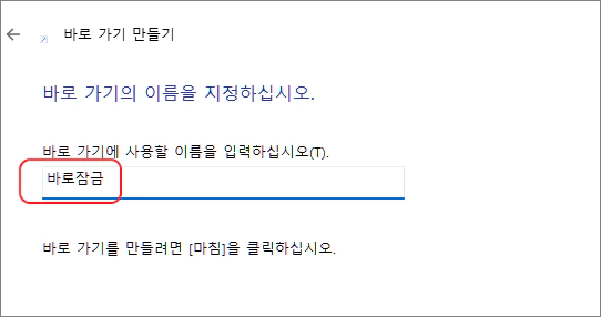 다음 진행 창에서 자신이 사용할 즉시 잠금 아이콘의 적당한 이름을 원하는 대로 지어 주고 하단의 마침 버튼을 클릭합니다.