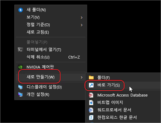 윈도우 바탕 화면에서 마우스 우클릭 후 새로 만들기 > 바로 가기 만들기를 클릭합니다.