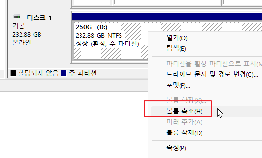 단일 파티션인 D 드라이브를 마우스 우클릭한 다음 볼륨 축소를 클릭합니다.