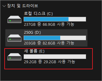 이렇게 하면 아래와 같이 자동으로 문자가 할당되고 포맷이 완료된 새로운 드라이브가 보입니다.