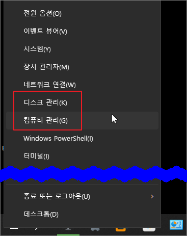 윈도우 시작 버튼을 마우스 우클릭한 다음 컴퓨터 관리를 클릭한 다음 디스크 관리로 진입하거나 바로 디스크 관리를 눌러 디스크 관리 창을 열 수 있습니다. 바탕 화면의 내 PC를 마우스 우클릭한 다음 관리를 클릭해도 같은 경로로 진입할 수 있습니다.