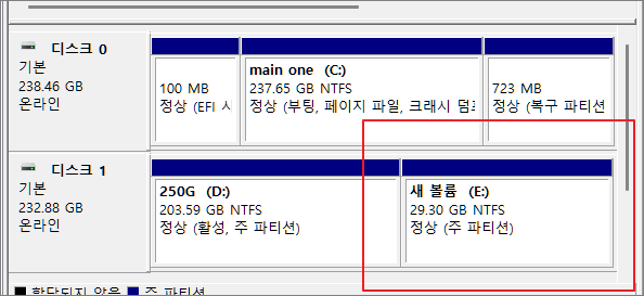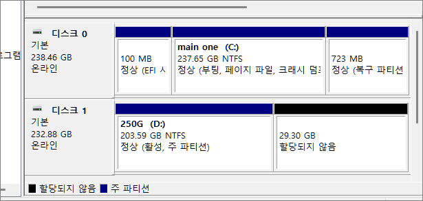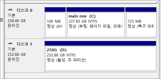 아래의 내용은 두 개의 물리적 디스크가 달려 있는 현재 사용 중인 제 PC에서 진행한 테스트 작업입니다.