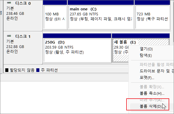 추가되었던 파티션에서 마우스 우클릭 후 볼륨 삭제를 진행하게 되면 할당되지 않은 드라이브 상태가 됩니다.