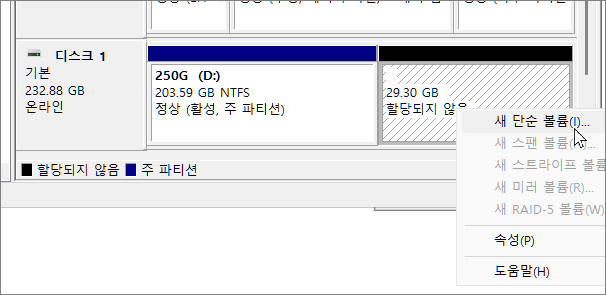 윈도우에서 드라이브를 할당해 정상적인 공간으로 사용하기 위해서는 드라이브 문자까지 할당해 주어야 합니다. 할당되지 않음 파티션 부분을 마우스 우클릭한 다음 새 단순 볼륨을 클릭해 줍니다.