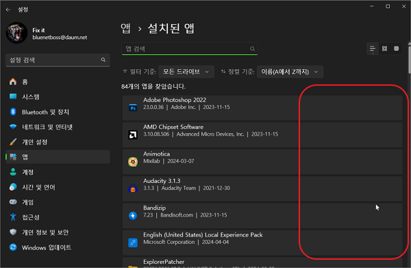 윈도우 11의 설정에서 앱을 제거할 버튼이 보이지 않는 경우