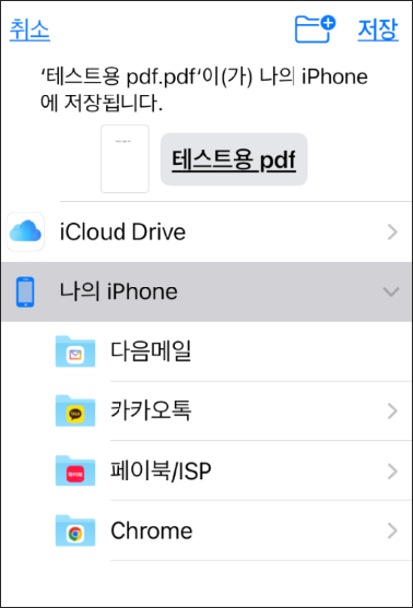 파일에 저장을 한번 터치하면 아이폰 파일 폴더 내의 저장할 폴더를 선택하는 화면이 열립니다.
