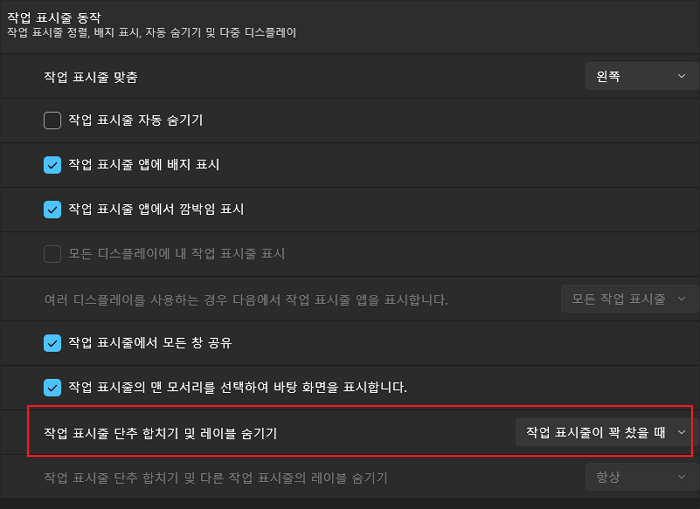 하부 메뉴 중 역시 가장 아래쪽에 있는 '작업 표시줄 단추 합치기 및 레이블 숨기기' 메뉴의 우측 드롭 다운 메뉴를 클릭하고 '작업 표시줄이 꽉 찼을 때'에서 '항상'으로 변경해 줍니다.