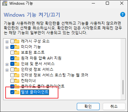 윈도우 기본 설정에서는 텔넷 기능이 꺼져 있으므로 이를 다시 켜주어야 합니다.