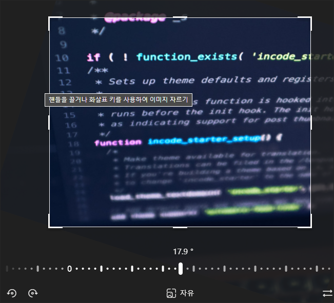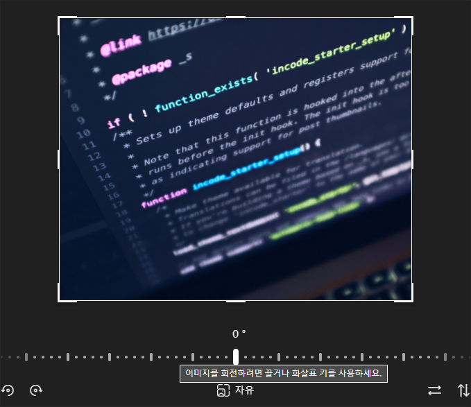 이미지의 아래쪽에 있는 눈금자를 0도를 제외한 좌우 아무곳이나 마우스 클릭한 다음 떼지말고 좌우로 움직여 보면 각도가 조절되고 있는 것을 실시간으로 볼 수 있습니다. 만일 이미지가 고정되어 있고 회전이 되지 않는 다면 중앙 아래쪽에 있는 자유라는 아이콘을 한번 클릭해 준 다음 작업을 계속합니다.