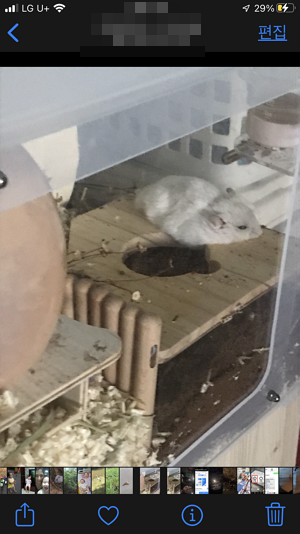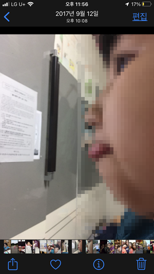 아이폰의 사진에서 편집하고자 하는 원하는 사진을 선택한 다음 하단 가장 좌측에 있는 보내기처럼 생긴 화살표 있는 아이콘을 눌러 줍니다.