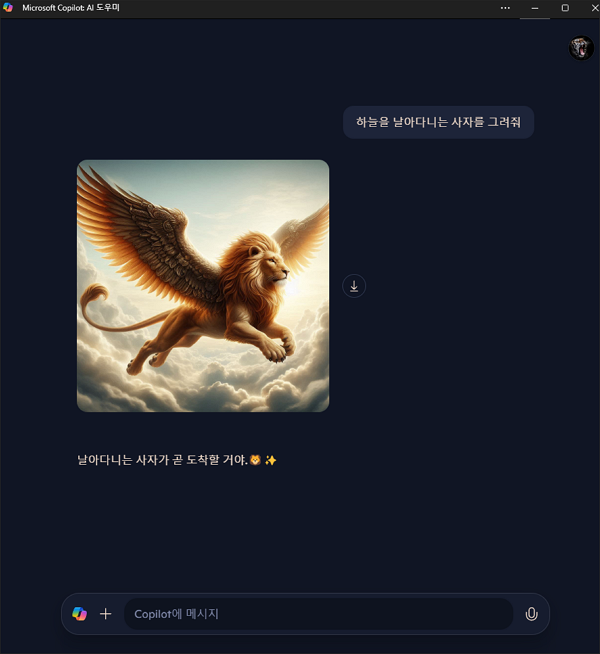 텍스트 문장의 경우에는 너무 뻔하여 딱히 물어볼 필요를 느끼지 않아 생략했고 궁금한 점이었던 이미지 생성만을 시도해 보았습니다. 처음으로 내린 명령이 실존하지 않는 날으는 사자를 그려달라는 것이었습니다.