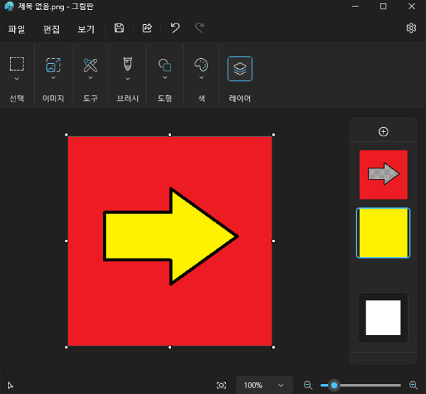 - 마지막으로 우측의 레이어 막대에서 상단의 노란색 레이어를 화살표 레이어 아래로 내립니다.