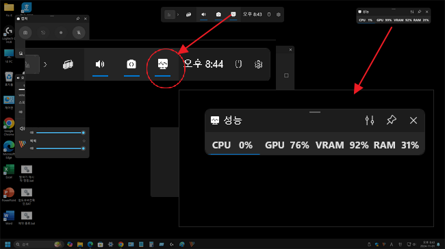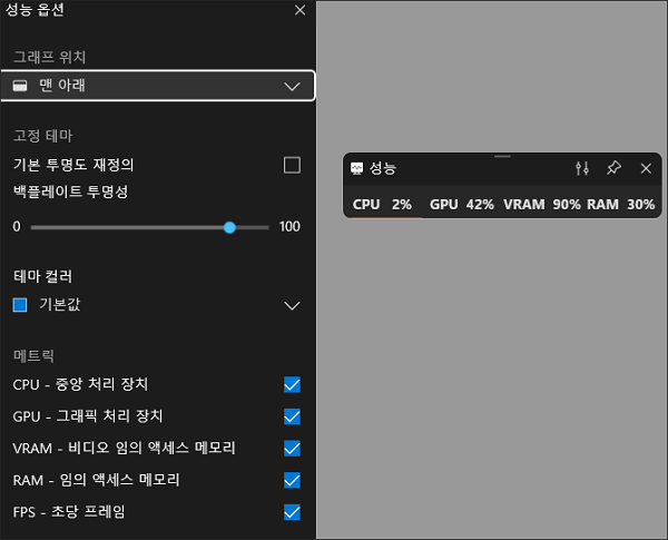이 기능은 물론 윈도우 시스템 작업 관리자의 성능 모니터링을 통해서도 관찰할 수 있지만 굉장히 광범위하게 자료를 제공해 주며 간단하게 위젯 형식으로 모니터링하는 용도로는 게임바의 성능 모니터링이 낫지 않을까 합니다.