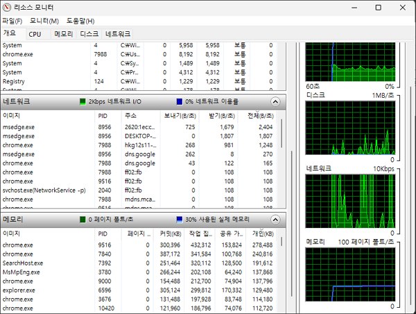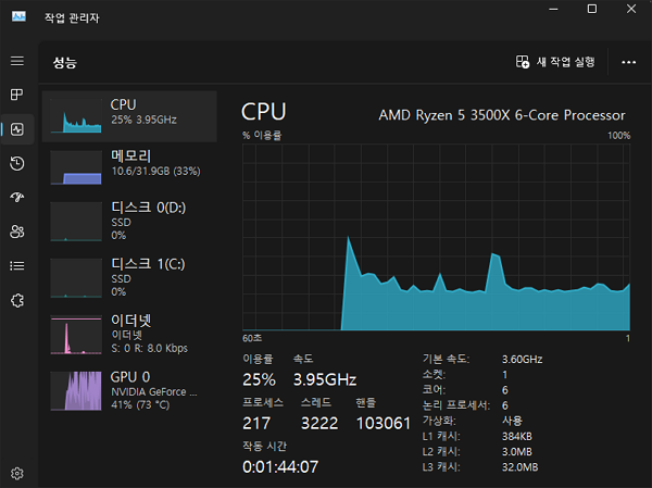 아래의 이미지는 윈도우 작업관리자를 실행한 다음 성능 탭을 선택하여 모니터링 중인 이미지입니다.