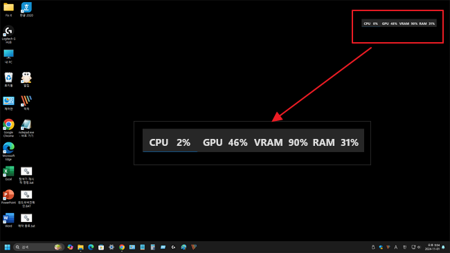 성능 바의 사용자화 설정이 끝났으면 적당 바탕화면 위치로 드래그한 다음 핀모양 아이콘을 클릭해 고정하면 이제 위젯과 유사한 모습으로 항상 시스템 주요 지표를 모니터링할 수 있습니다. 참고로 이 성능 모니터링 바를 작업표시줄로 드래그하여 내리면 마치 작업표시줄에서 작동하고 있는 듯한 느낌을 줄 수 있습니다.