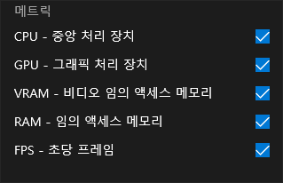 모니터링이 가능한 부분은 CPU, GPU, VRAM, RAM, FPS 등입니다.