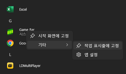 그런데 게임바 설정에서 윈도우 시작 시 자동으로 시작하게 하거나 성능 위젯만 분리해서 사용하는 옵션은 존재하지 않았습니다. 다소 불편하지만 조금은 덜 불편한 방법으로 저는 시작 프로그램의 게임바 아이콘을 우클릭한 다음 작업 표시줄에 등록하여 사용 중입니다.