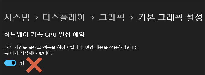 이 문제를 해결하려면 윈도우 설정 > 시스템 > 디스플레이 > 그래픽 > 기본 그래픽 설정으로 이동한 다음 '하드웨어 가속 GPU 일정 예약' 옵션을 꺼두도록 합니다.