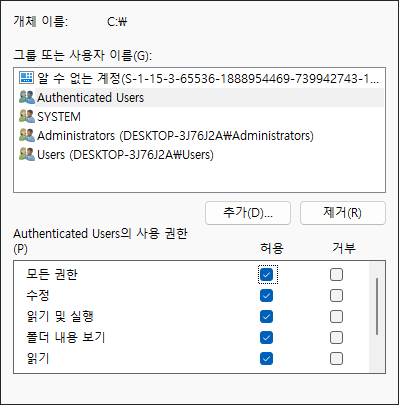 보안 탭에서 그룹 또는 사용자 이름 항목에 있는 사용자중 Authenticated Users를 선택한 다음 편집을 클릭하고 모든 권한을 부여해 줍니다. 만일 현재 윈도우가 모든 권한을 가진 관리자 계정으로 로그인된 상태라면 이 작업에 문제가 없을 것으로 보입니다. 만일, 권한을 줄 수 없는 상태라면 먼저 관리자 계정으로 로그인되어 있는 상태인지, 관리자 계정에 모든 권한이 부여되어 있는지 등을 검토해 보아야 합니다.
